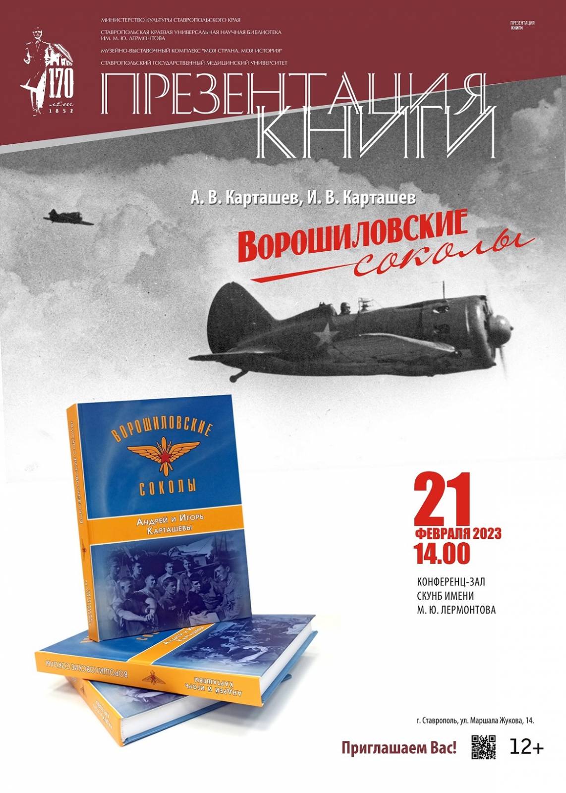 21 февраля 2023 года в 14 часов в конференц-зале Ставропольской краевой универсальной научной библиотеки им. М. Ю. Лермонтова состоится презентация книги «Ворошиловские соколы» А. В. Карташева, И. В. Карташева.