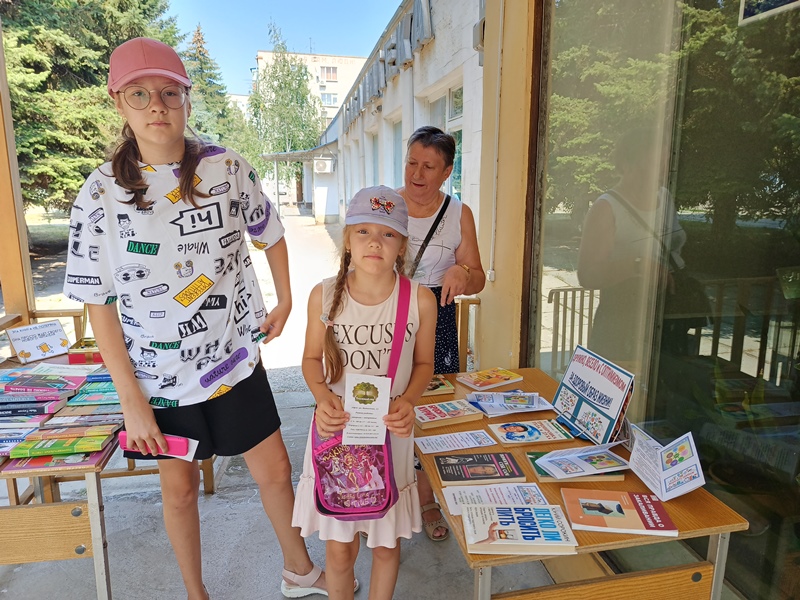 9 8 3 Посетители библиотеки и просто прохожие с интересом рассматривали литературу, представленную на выставке-просмотре «Мы за здоровый образ жизни!», и на буккроссинге с изданиями по данной тематике. Каждый желающий получил возможность найти полезную для себя книгу и забрать в личное пользование. А в качестве закладки, библиотекари дарили листовку «Модно быть здоровым» и информационный буклет «Мы за здоровый образ жизни!». Молодым участникам акции предлагалось ответить на вопросы викторины о популярных видах спорта и зачитать бодрые речёвки о пользе занятий физкультурой в укреплении здоровья человека.
