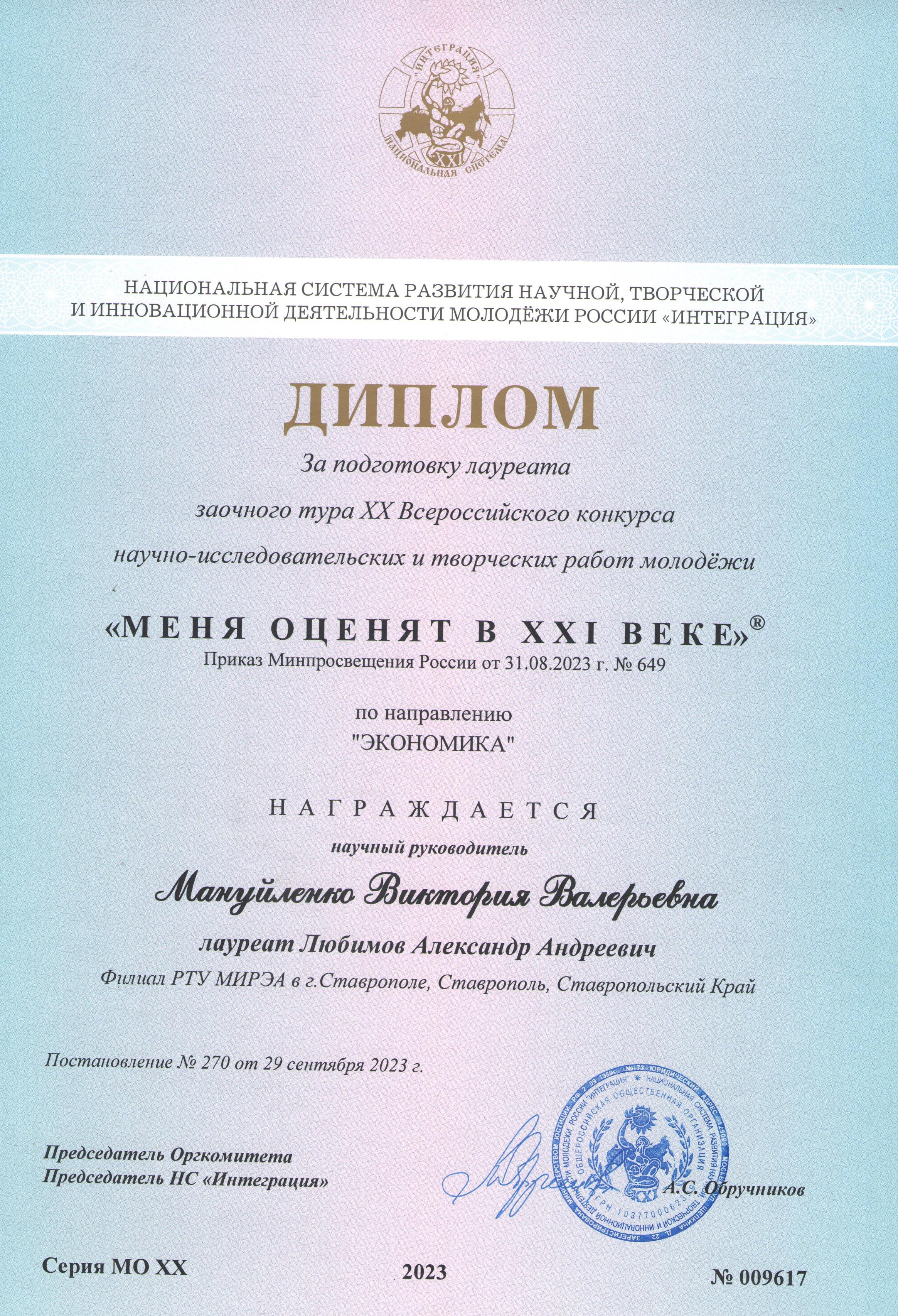 С 23 по 26 октября 2023 г. студент 4 курса направления подготовки 38.03.01 Экономика Александр Любимов принял участие во Всероссийском конкурсе научно-исследовательских и творческих работ молодежи «Меня оценят в 21 веке», который проходил в Москве на базе Национальной системы развития научной, творческой и инновационной деятельности молодёжи России «ИНТЕГРАЦИЯ». Конкурс проходил в два этапа: заочный и очный. В ходе прохождения заочного этапа были отобраны лучшие работы, а их авторы приглашены для защиты конкурсных работ в очном формате. В очном этапе приняли участие более 230 участников из разных регионов Российской Федерации (Краснодарский, Красноярский, Ставропольский края, Амурская, Астраханская, Белгородская, Владимирская, Вологодская, Воронежская, Ивановская, Иркутская, Калужская, Калининградская, Костромская, Московская, Ростовская, Свердловская, Новосибирская, Челябинская, Ярославская области, Республики Адыгея, Дагестан, Северная-Осетия Алания, Санкт-Петербург, Ханты-Мансийский автономный округ – Югра и др.).