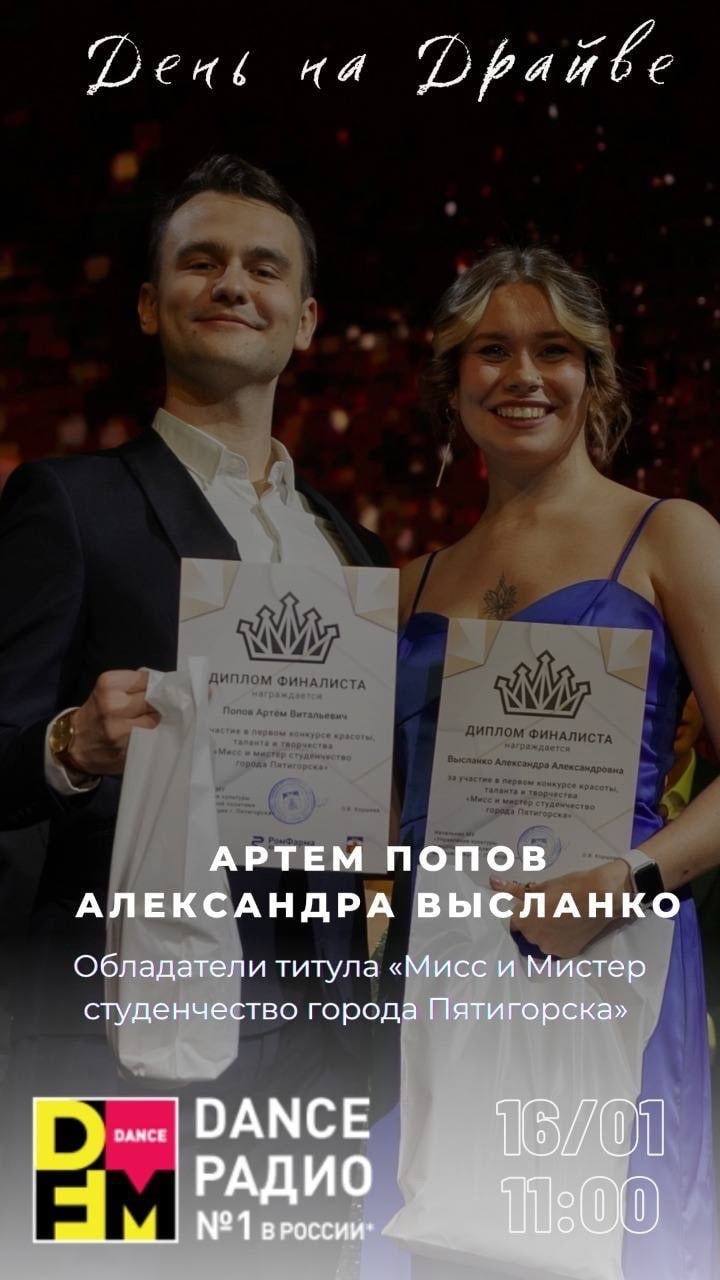 К сожалению, так будет не всегда! Но тем не менее уже сегодня в 11:00 на радио DFM впервые обладатели титула «Мисс и Мистер студенчество города Пятигорска» – студенты Пятигорского медико-фармацевтического института – Александра Высланко и Артем Попов поделятся своими впечатлениями, опытом участия в конкурсе и не только…
