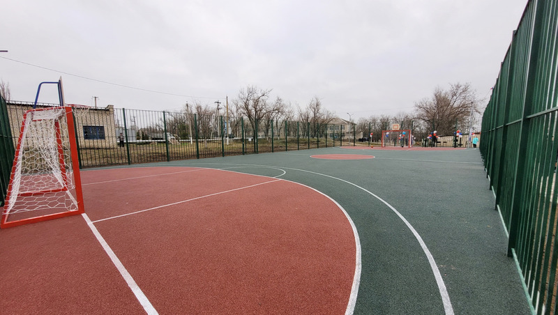 На площадке сделали основание из резиновой крошки для игровых видов спорта, установили ворота и ограждение. В открытой зоне смонтировали тренажёры и оборудование для воркаута, скамейки, а также освещение.