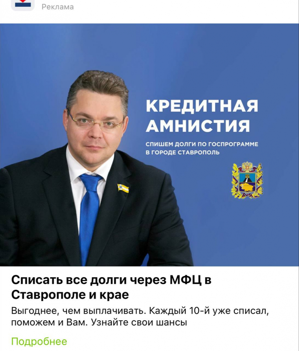 В объявлении рядом с портретом главного регионального управленца указана надпись «Кредитная амнистия», а чуть ниже — обещание «Спишем долги по госпрограмме в городе Ставрополь». Автор публикации предлагает избавить людей от задолженности через МФЦ по всему краю.