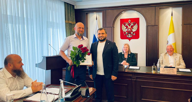 Присутствующий на заседании депутат краевой Думы Жаник Гончаров вручил Почетную грамоту Думы Ставропольского края за многолетний добросовестный труд депутату Думы города Пятигорска, атаману Горячеводской казачьей общины Владимиру Савченко.