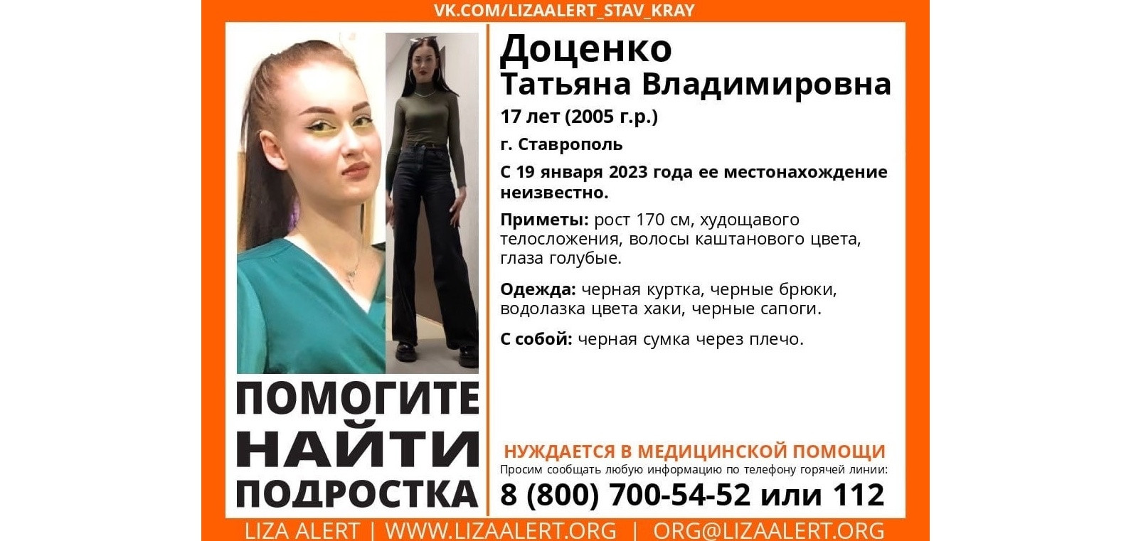 на вид 17 лет, рост 170 см, худощавого телосложения, волосы каштанового цвета, глаза голубые; в день пропажи была одета в куртку и брюки черного цвета, водолазку цвета хаки и черные сапоги. Также с собой у девушки была черная сумка через плечо.С информацией можно обратиться в отдел полиции № 3 по адресу г. Ставрополь ул. Балахонова, 13 А , а также позвонить по бесплатным телефонам: