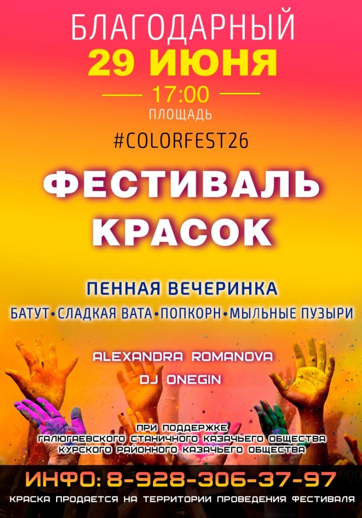 29 июня в 17:00 на площади Ленина города Благодарного состоится фестиваль красок, пенная вечеринка и дискотека.