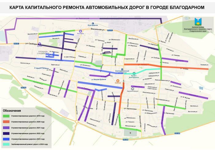 - г. Благодарный, участок автомобильной дороги общего пользования местного значения по ул. Советской (от дома №355) протяженностью 1 400 метров на сумму 43 530 098,7 рублей;