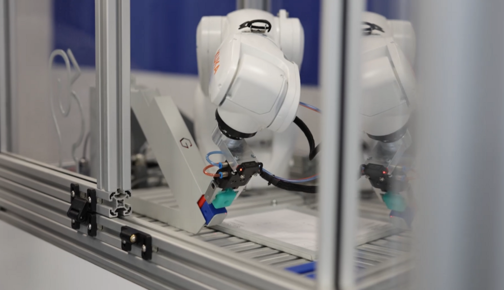 Промышленный робот Kuka, отлично справляется с поставленной задачей – осуществляет пневмозахват и простую сортировку. Коме того, он способен выполнять широкий спектр задач, может перемещать предметы в пространстве по 6-ти осям координатам в пределах зоны досягаемости.