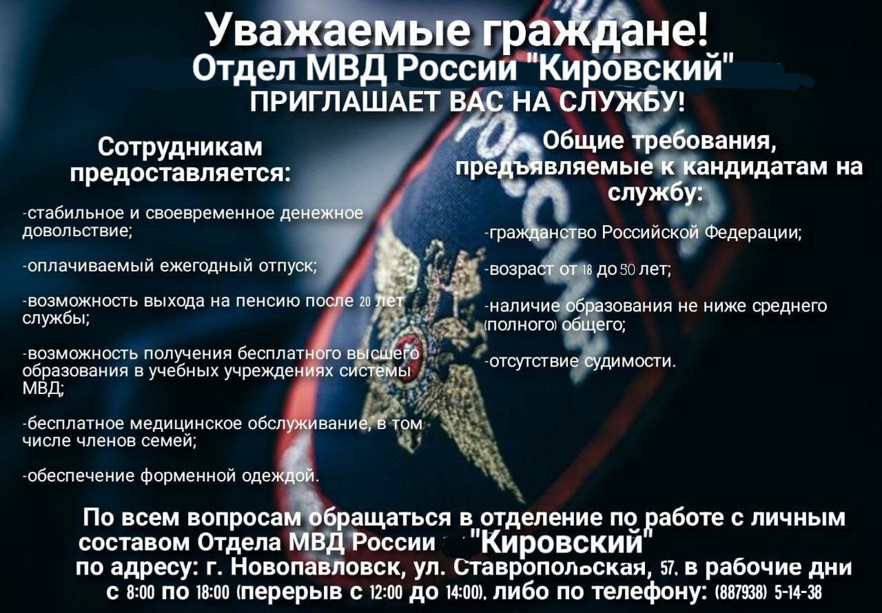 Отдел МВД России «Кировский» объявляет отбор кандидатов для прохождения службы в органах внутренних дел на следующие должности: полицейский патрульно-постовой службы полиции, участковый уполномоченный полиции, помощник оперативного дежурного дежурной части.