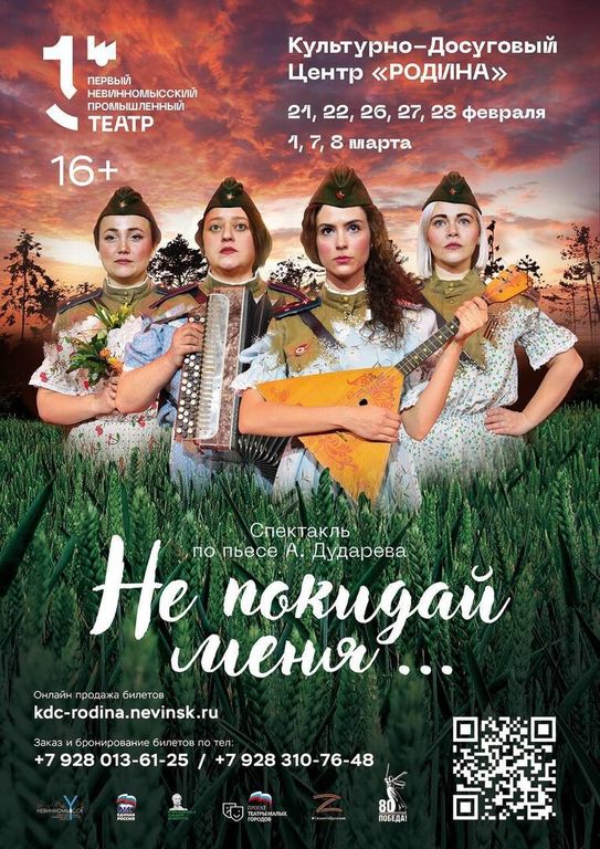 «Не покидай меня…» — драматическая баллада о войне, любви, чести и чувстве долга, о человеческих ценностях и необходимости идти на все во имя Родины. Спектакль поставлен по одноименной пьесе белорусского драматурга Алексея Дударева и основан на реальных событиях 1944 года.