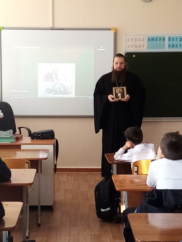 3 февраля 2023 года в школе №4 поселка имени Кирова настоятель храма Пророка Илии иерей Сергий Божко провел классный час для учащихся 4 класса.