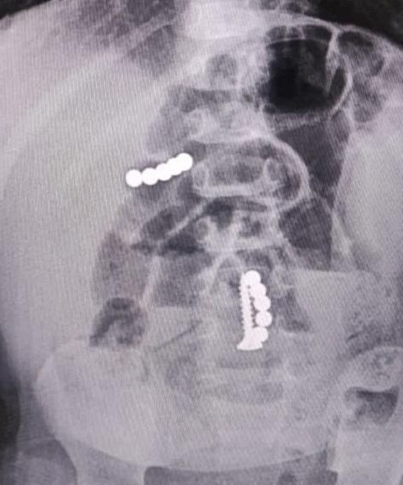 На скорой ребёнка отвезли в детскую краевую больницу. Дежурный врач, несмотря на отсутствие прямых признаков хирургического заболевания, всё же решил сделать малышу рентгенографию брюшной и грудной полости. На снимках он увидел множество магнитов и саморез в желудке и кишечнике пациента.