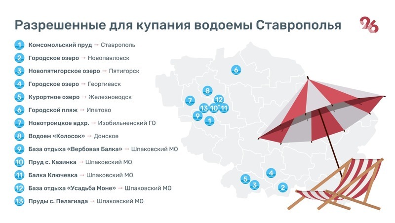 На сегодняшний день в Ставропольском крае выдали 14 разрешений на использование водных объектов в рекреационных целях. Среди них Комсомольский пруд города Ставрополя, Городское озеро Новопавловска, Новопятигорское озеро, Городское озеро Георгиевска, Курортное озеро Железноводска, Городской пляж Ипатово, две базы отдыха Новотроицкого водохранилища, водоём МБОУ ДО ДООПЦ «Колосок» в селе Донском, база отдыха «Вербовая Балка» в Шпаковском округе, пруд села Казинка, база отдыха на участке акватории балки Ключевка, пруды на территории спортивно-оздоровительного комплекса в Пелагиаде и база отдыха «Усадьба Mone».